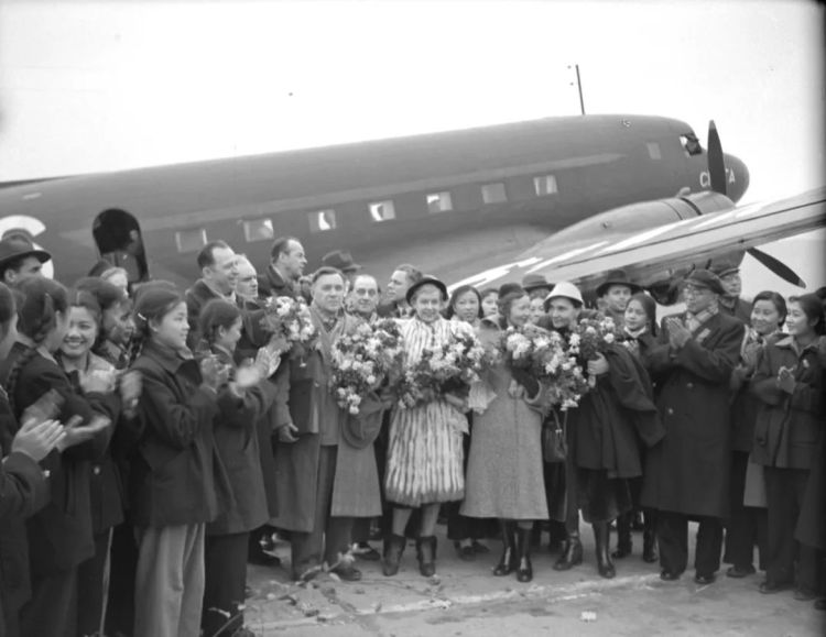 ↑應(yīng)邀參加“中蘇友好月”的蘇聯(lián)電影藝術(shù)工作者代表團團長費道羅夫一行、蘇聯(lián)藝術(shù)工作團團員烏蘭諾娃等藝術(shù)家抵達北京,在機場受到中國文化界、電影界人士熱烈歡迎。(1952年11月6日,袁浩)