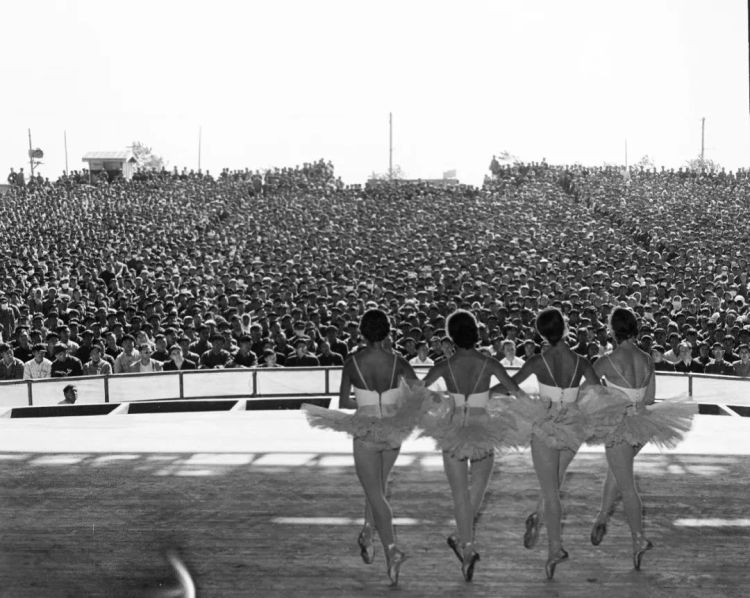 ↑蘇聯(lián)國立新西伯利亞歌劇芭蕾舞劇院為北京石景山鋼鐵廠工人演出。(1957年10月,鄭震孫)
