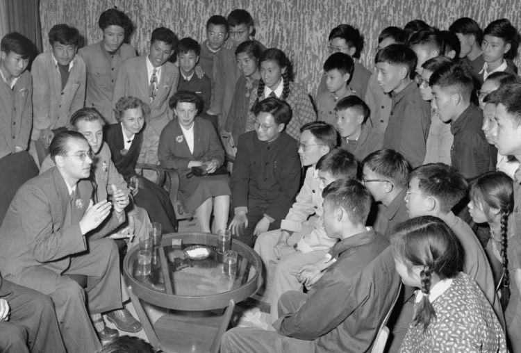↑共青團員們在上海舉行聯(lián)歡會,慶祝十月革命40周年。這是上海學(xué)生和蘇聯(lián)青年代表保爾·沙柯夫等交談。(1957年11月5日,楊溥濤)