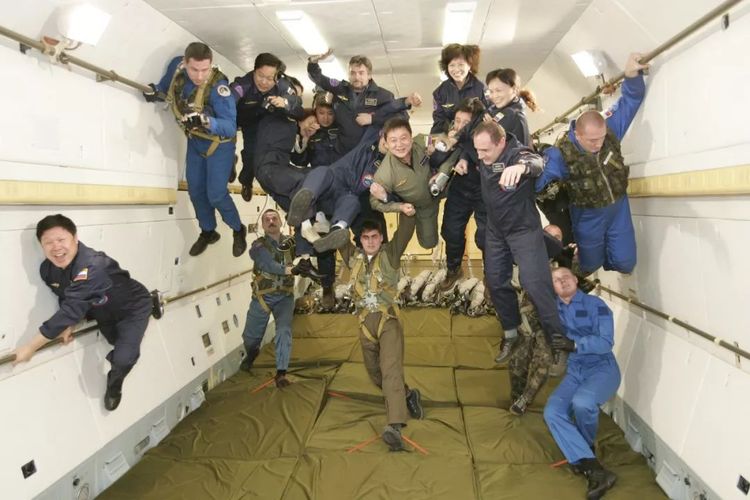 ↑在俄羅斯首都莫斯科的加加林阿特拉斯宇航中心,10名中國游客在俄羅斯宇航員的保護下體驗太空失重訓(xùn)練。(2004年12月17日,陳建力)