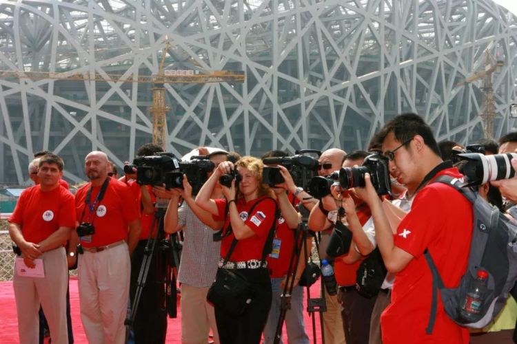 ↑參加“中俄友誼之旅·中國行”報道組的中俄兩國媒體記者在北京奧體中心采訪。(2007年6月25日,李明放)