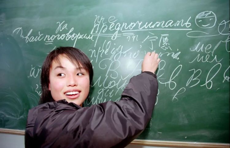 ↑中國滿洲里的一位老師在給學(xué)生上俄語課。 (2004年,葉夫格尼·葉潘欽采夫)