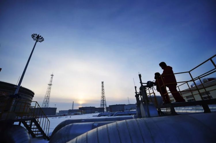 ↑黑龍江大慶,兩名工人在剛剛投產(chǎn)的中俄原油管道林源輸油站巡檢。(2011年1月10日,王建威)