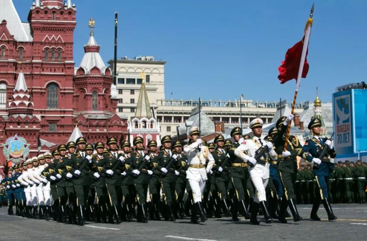 ↑莫斯科,中國人民解放軍三軍儀仗隊參加紀(jì)念衛(wèi)國戰(zhàn)爭勝利70周年紅場閱兵式總彩排。(2015年5月7日,馬占成)