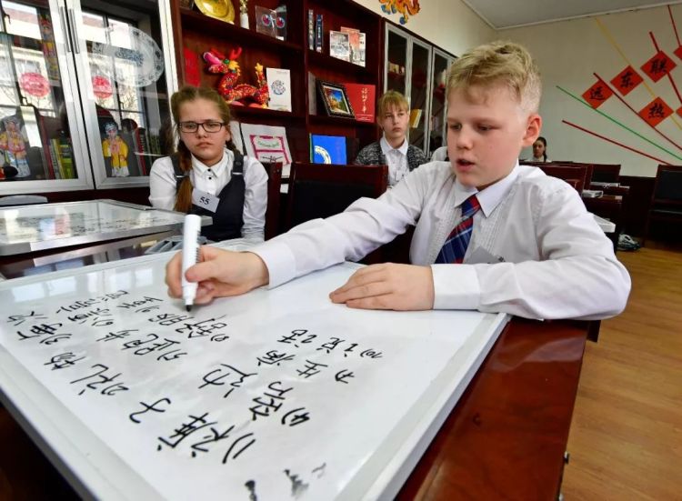↑俄羅斯學(xué)生在符拉迪沃斯托克遠東聯(lián)邦大學(xué)孔子學(xué)院書寫漢字。(2017年,尤里·斯米秋克)