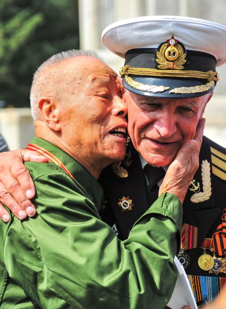 ↑吉林長春,中俄雙方抗戰(zhàn)老戰(zhàn)士在祭奠蘇聯(lián)紅軍烈士活動上相擁。(2015年9月2日,許暢)