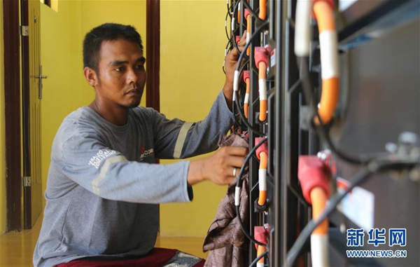 6月6日,在菲律賓北部偏遠山區(qū)的巴利瓦特村,村民迪奧內(nèi)斯托·埃斯特萬在太陽能發(fā)電站進行電力設(shè)備日常檢查和維護。新華社記者 鄭昕 攝