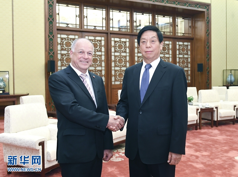 6月10日,全國(guó)人大常委會(huì)委員長(zhǎng)栗戰(zhàn)書在北京會(huì)見(jiàn)以?shī)W地利聯(lián)邦議會(huì)議長(zhǎng)英戈·阿佩為團(tuán)長(zhǎng)的奧中友協(xié)高級(jí)代表團(tuán)。 新華社記者 燕雁 攝