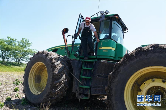 6月9日,在位于美國中部密蘇里州的小鎮(zhèn)奧里克,湯姆·沃特斯從一輛拖拉機上下來。新華社記者 劉杰 攝