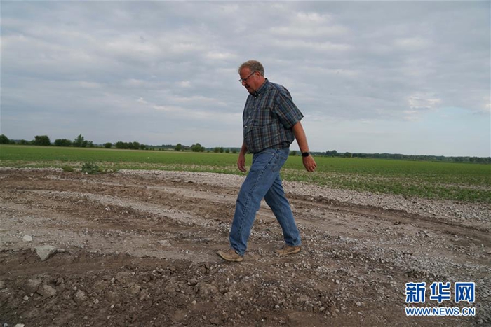 6月9日,在位于美國中部密蘇里州的小鎮(zhèn)奧里克,湯姆·沃特斯走在自己的農田上。新華社記者 劉杰 攝