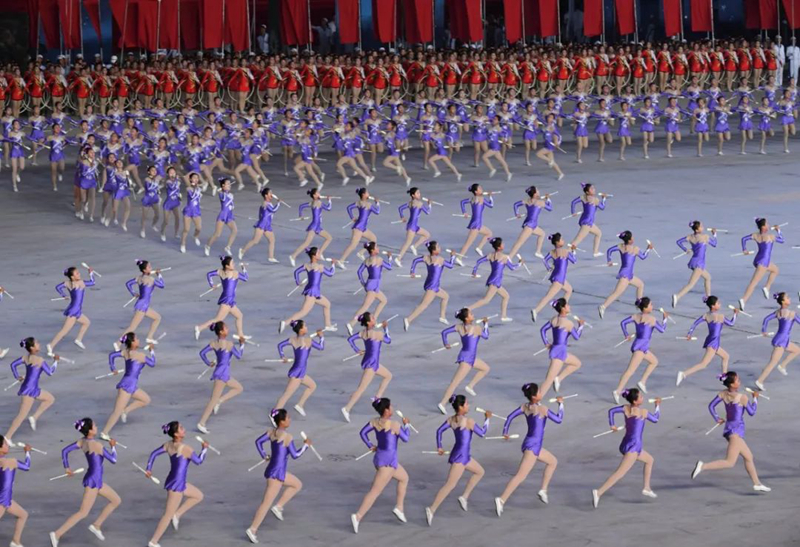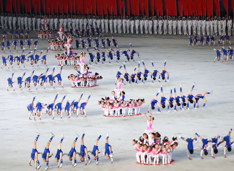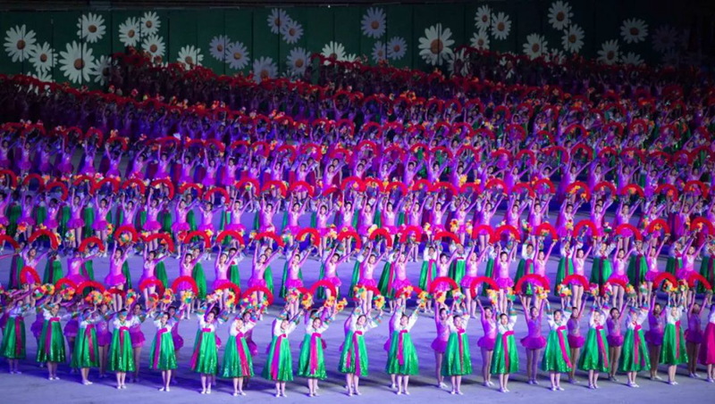 平壤大同江畔,綾羅島“五一”體育場是團(tuán)體操的主要舞臺。演出以朝鮮民族獨(dú)特的“歌舞之美”、富有活力的團(tuán)體操、嘆為觀止的雜技表演,展現(xiàn)出朝鮮革命與戰(zhàn)爭、政治和軍隊(duì)建設(shè)、民生與經(jīng)濟(jì)發(fā)展以及對外交往的宏偉畫卷。