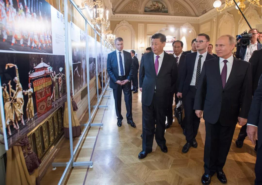 ↑6月5日,習主席和普京總統(tǒng)在莫斯科大劇院共同出席中俄建交70周年紀念活動。活動前,兩國元首共同參觀中俄建交70周年圖片展。新華社記者李學仁攝