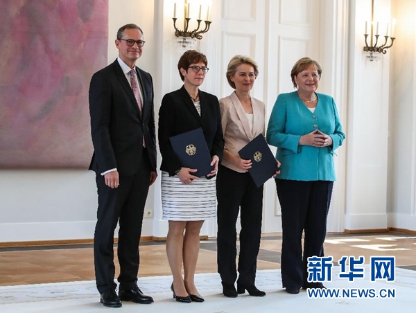 克蘭普-卡倫鮑爾當(dāng)天在德國總統(tǒng)府接受任命書。總理默克爾、馮德萊恩以及聯(lián)邦參議院第一副議長(zhǎng)米歇爾·穆勒出席任命儀式。