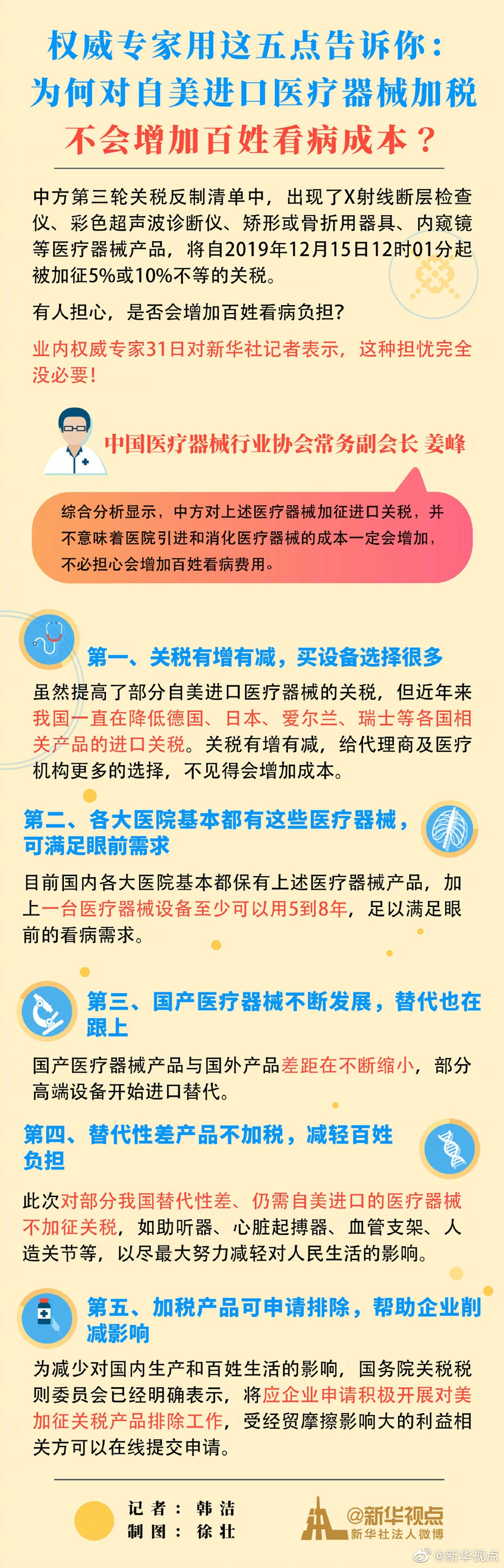 對(duì)此,中國(guó)醫(yī)療器械行業(yè)協(xié)會(huì)常務(wù)副會(huì)長(zhǎng)姜峰31日接受記者采訪時(shí)說,綜合分析顯示,中方對(duì)上述醫(yī)療器械加征進(jìn)口關(guān)稅,并不意味著醫(yī)院引進(jìn)和消化醫(yī)療器械的成本一定會(huì)增加,不必?fù)?dān)心會(huì)增加百姓看病費(fèi)用。