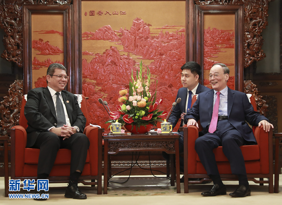 9月12日,國家副主席王岐山在北京中南海會見馬來西亞外長賽夫丁。 新華社記者 丁林 攝
