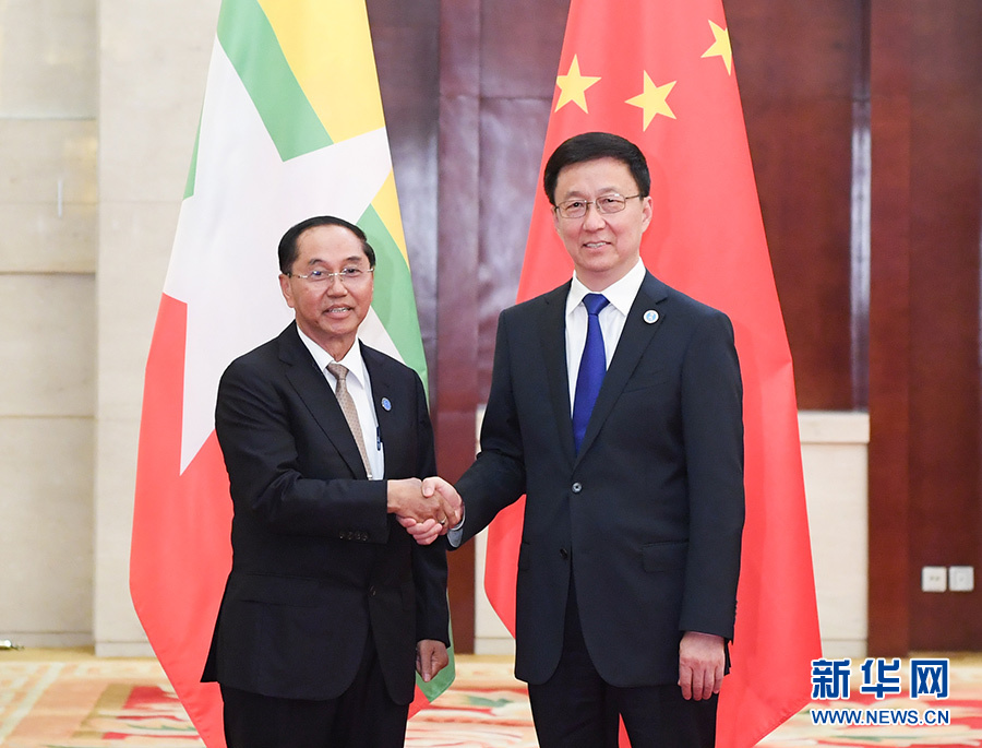 9月20日,中共中央政治局常委、國(guó)務(wù)院副總理韓正在廣西南寧會(huì)見(jiàn)出席第十六屆中國(guó)—東盟博覽會(huì)和中國(guó)—東盟商務(wù)與投資峰會(huì)的緬甸副總統(tǒng)敏瑞。 新華社記者 申宏 攝