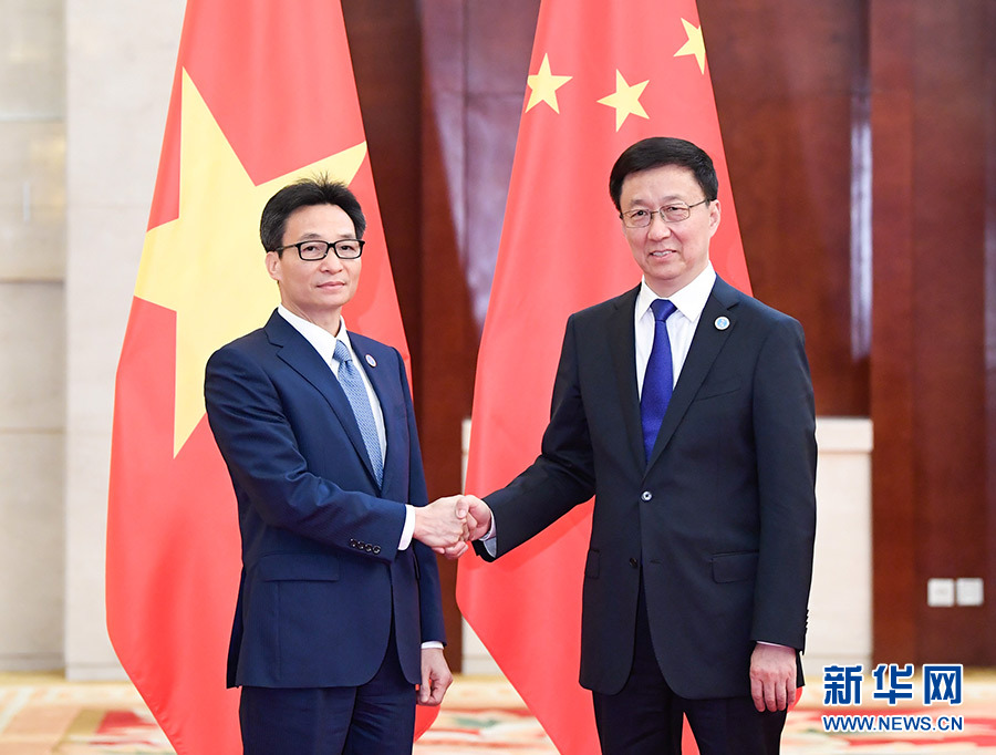 9月20日,中共中央政治局常委、國(guó)務(wù)院副總理韓正在廣西南寧會(huì)見(jiàn)出席第十六屆中國(guó)—東盟博覽會(huì)和中國(guó)—東盟商務(wù)與投資峰會(huì)的越南副總理武德?lián)?新華社記者 申宏 攝