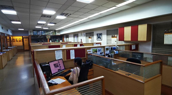 文卡特斯瓦倫負(fù)責(zé)《印度教徒報》的頭條版樣設(shè)計。他的辦公室門口,整整齊齊地碼放著其他報紙的刊樣。