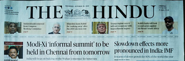 10日清晨6時,當(dāng)天的《印度教徒報》已送抵讀者手中。頭條為兩國領(lǐng)導(dǎo)人非正式會晤將于明日起在金奈舉行的消息。