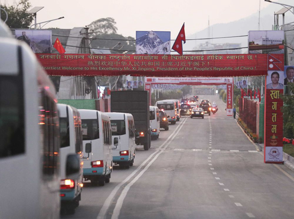 10月12日,尼泊爾首都加德滿都,車隊(duì)經(jīng)過(guò)一道道迎賓拱門。新華社記者丁林?jǐn)z