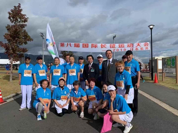 日本長井市市長內(nèi)谷重治、副市長平進(jìn)介、國際長征運(yùn)動(dòng)會(huì)創(chuàng)始人杜地以及部分運(yùn)動(dòng)員在比賽現(xiàn)場合影。(圖片由國際長征運(yùn)動(dòng)會(huì)委員會(huì)提供)
