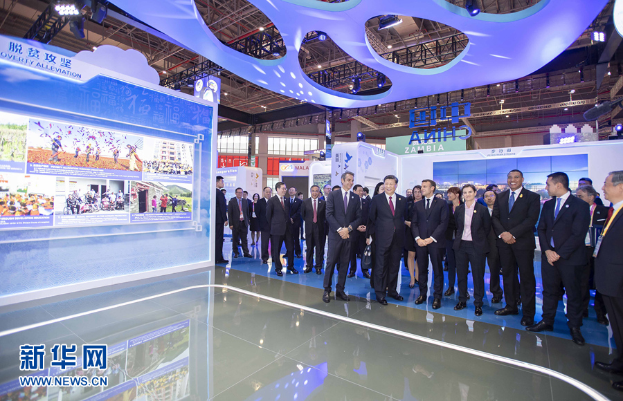 中外領導人饒有興趣地邊走邊看。習近平走進部分國家展館。坦桑尼亞的腰果,希臘的美食和藝術品,意大利的葡萄酒,牙買加的藍山咖啡、朗姆酒蛋糕,印度尼西亞的棕櫚油,俄羅斯的新型直升機和汽車,琳瑯滿目。