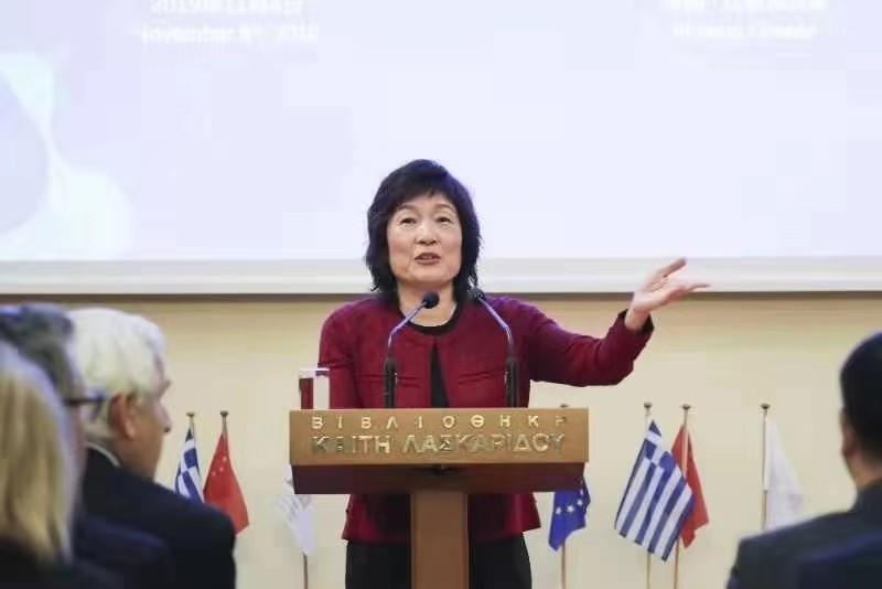 中國(guó)駐希臘大使章啟月在研討會(huì)上致辭。中國(guó)日?qǐng)?bào)記者 匡林華 攝