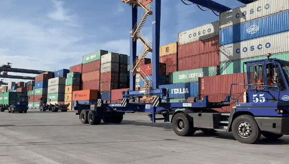 一輛輛集裝箱式半掛車、碼頭叉車穿梭往來,有條不紊地裝卸貨物?,F(xiàn)代化的比雷埃夫斯集裝箱碼頭繁忙有序。