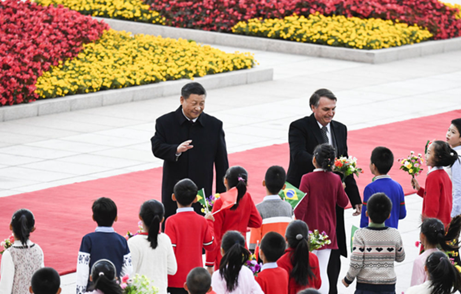 圖為2019年10月25日,習近平在人民大會堂東門外廣場為到訪的巴西總統博索納羅舉行歡迎儀式。在巴西出席金磚國家領導人會晤期間,習主席還將同博索納羅總統舉行會談。這將是一個月內兩國元首再次互動。新華社記者高潔攝