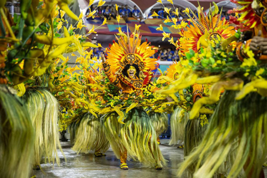 2019年3月4日晚,在巴西里約熱內(nèi)盧,桑巴舞校演員參加狂歡節(jié)游行。新華社記者李明攝