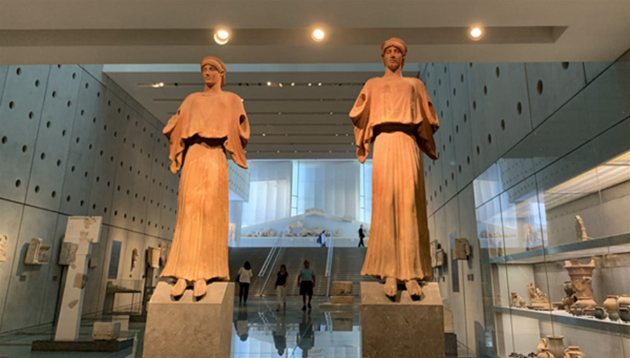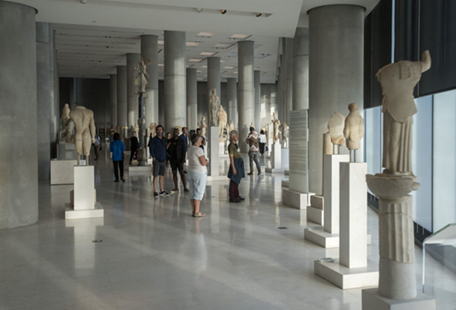 地中海溫暖的陽光透過雅典衛(wèi)城博物館玻璃幕墻灑入展廳,一座座古希臘神話人物和建筑雕像栩栩如生,展示著美和力量,訴說著希臘古典藝術的燦爛輝煌,令人仿佛徜徉于歷史長河里,沉醉在文明畫卷中。