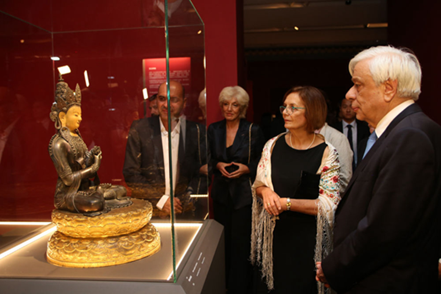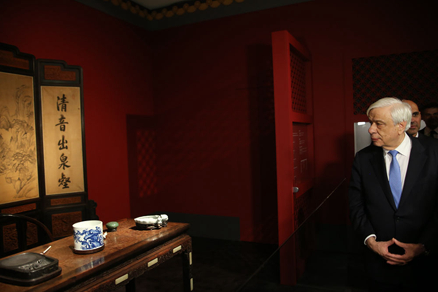 2018年9月14日,在希臘首都雅典衛(wèi)城博物館,希臘總統(tǒng)帕夫洛普洛斯(右)在“重文德之光華:重華宮原狀文物展”上參觀。這是來自中國故宮博物院的154件清朝乾隆時期珍貴文物首次出國展出。新華社發(fā)(馬里奧斯·羅洛斯攝)