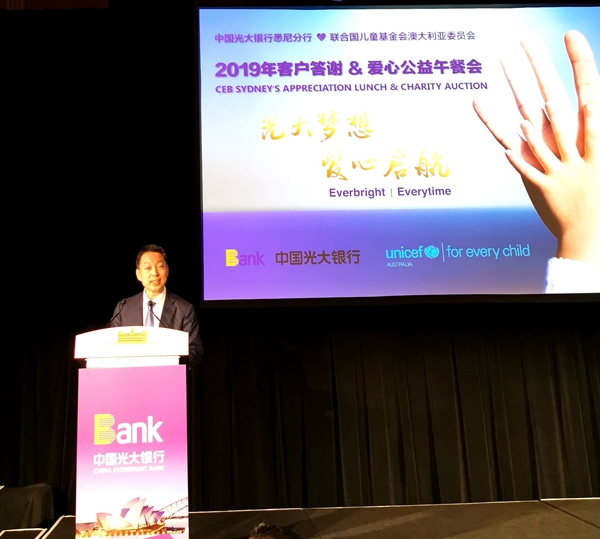 中國(guó)光大銀行悉尼分行行長(zhǎng)于洪德在拍賣(mài)會(huì)開(kāi)始前致辭說(shuō),光大銀行衷心感謝廣大客戶(hù)和合作伙伴對(duì)其業(yè)務(wù)發(fā)展的支持,希望通過(guò)慈善拍賣(mài)為澳大利亞兒童健康成長(zhǎng)盡一份力、作更多貢獻(xiàn)。