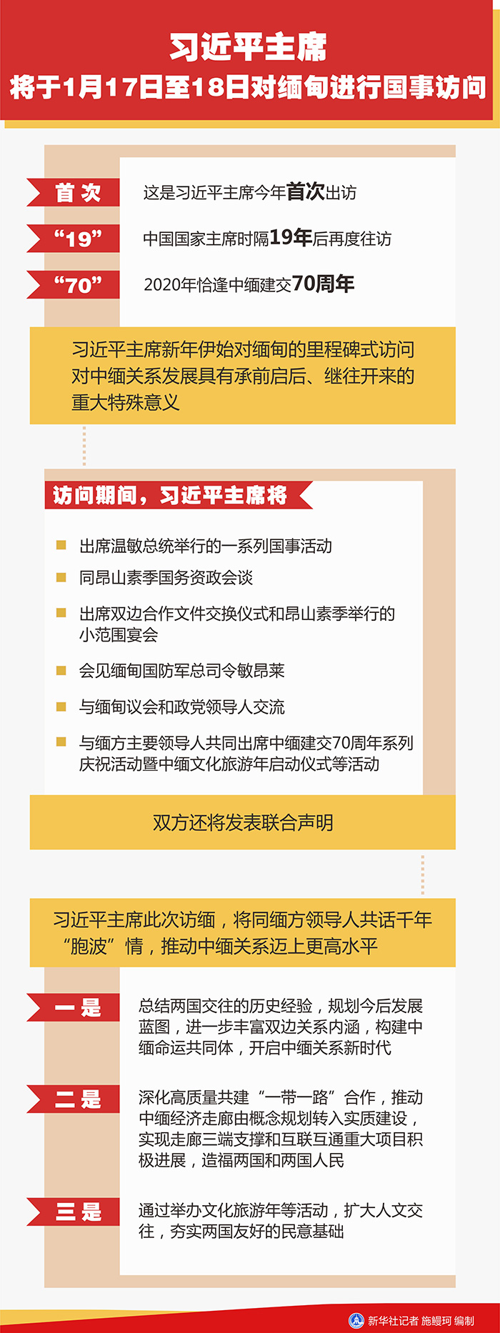 羅照輝表示,應(yīng)溫敏總統(tǒng)邀請(qǐng),習(xí)近平主席將于1月17日至18日對(duì)緬甸進(jìn)行國(guó)事訪問(wèn)。這是習(xí)近平主席今年首次出訪,是中國(guó)國(guó)家主席時(shí)隔19年后再度往訪,又恰逢中緬建交70周年,對(duì)中緬關(guān)系發(fā)展具有承前啟后、繼往開(kāi)來(lái)的重大特殊意義。緬甸是中國(guó)友好鄰邦。當(dāng)前,兩國(guó)政治上高度互信,經(jīng)濟(jì)上深度合作,國(guó)際地區(qū)問(wèn)題上密切配合,“胞波”情誼歷久彌新,民間往來(lái)高位運(yùn)行。建交70年來(lái),中緬關(guān)系在互尊、互信、互助的基礎(chǔ)上不斷發(fā)展,樹(shù)立了大小國(guó)家間和睦相處、合作共贏的典范。中方堅(jiān)持不干涉緬內(nèi)政,堅(jiān)定支持緬甸維護(hù)國(guó)家尊嚴(yán)和合法權(quán)益。在緬甸國(guó)內(nèi)和平和解問(wèn)題上,中方勸和促談,發(fā)揮建設(shè)性作用。緬方在涉及臺(tái)灣、西藏、新疆問(wèn)題上一直堅(jiān)定支持中方。緬甸積極響應(yīng)和參與“一帶一路”合作倡議。中緬經(jīng)濟(jì)走廊及大項(xiàng)目合作帶動(dòng)了緬方沿線就業(yè)和經(jīng)濟(jì)發(fā)展,極大提升了當(dāng)?shù)厝嗣裆钏健V芯拡?jiān)持踐行和平共處五項(xiàng)原則,堅(jiān)持國(guó)際關(guān)系基本準(zhǔn)則,支持多邊主義、維護(hù)自由貿(mào)易,共同為推動(dòng)建立公正合理的新型國(guó)際關(guān)系作出貢獻(xiàn)。雙方在聯(lián)合國(guó)、東亞合作等場(chǎng)合相互支持,在建立中國(guó)-東盟自貿(mào)區(qū),區(qū)域全面經(jīng)濟(jì)伙伴關(guān)系、“南海行為準(zhǔn)則”磋商等方面密切協(xié)調(diào)配合。