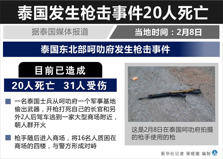 泰國媒體8日援引泰國國防部發(fā)言人空奇的話報(bào)道說,此次槍擊事件已造成20人死亡。另據(jù)媒體報(bào)道,槍擊事件的傷者已達(dá)31人。