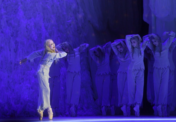 2004年12月28日,為慶祝日本松山芭蕾舞團理事長清水正夫獲得中國“文化交流貢獻獎”,日本松山芭蕾舞團在東京上演現(xiàn)代芭蕾舞劇《白毛女》,第二代白毛女扮演者森下洋子(中)在舞劇《白毛女》中飾演“喜兒”。 新華社記者馬平攝