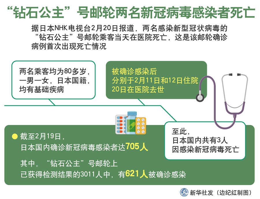 新華社東京2月20日電 據(jù)日本NHK電視臺20日報道,兩名感染新型冠狀病毒的“鉆石公主”號郵輪乘客當天在醫(yī)院死亡,這是該郵輪確診病例首次出現(xiàn)死亡情況。