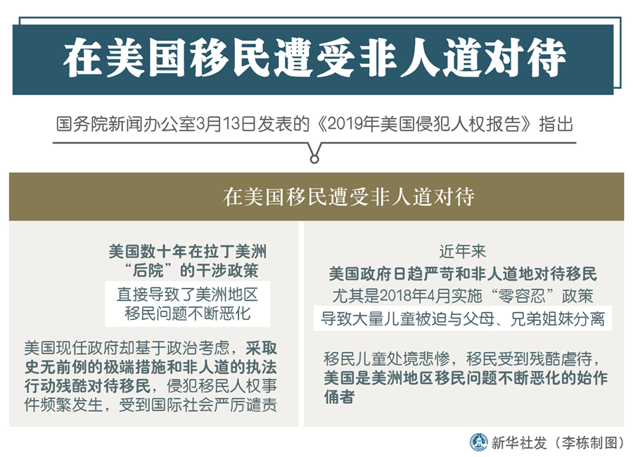 新華社北京3月13日電(記者王鵬、李超)國務(wù)院新聞辦13日發(fā)表的《2019年美國侵犯人權(quán)報告》指出,在美國移民遭受非人道對待。