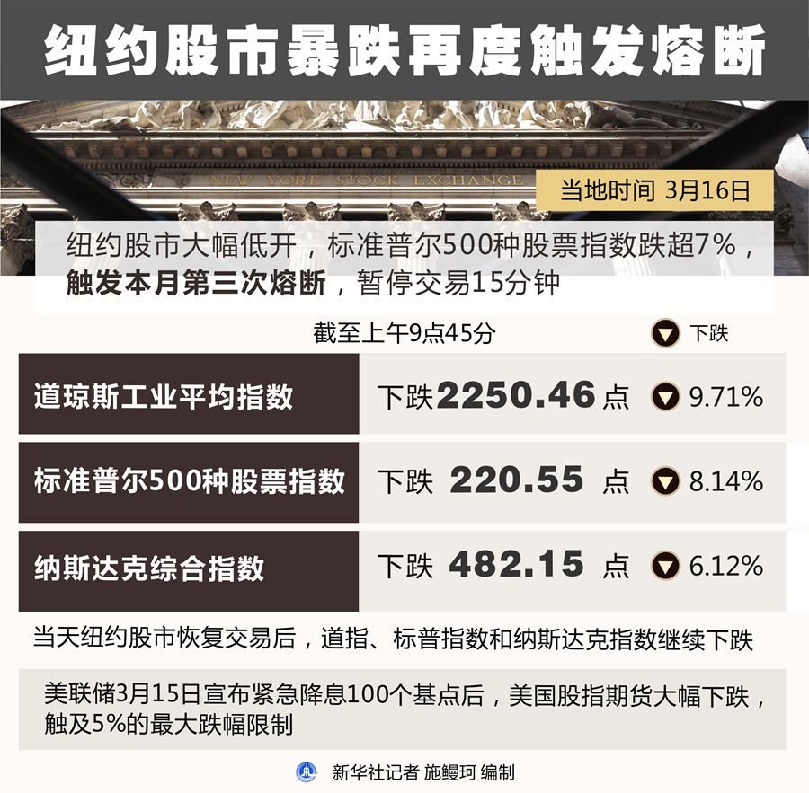 由于新冠肺炎疫情在美國(guó)持續(xù)擴(kuò)散引發(fā)市場(chǎng)廣泛擔(dān)憂,紐約股市16日開盤暴跌,并再次觸發(fā)7%的熔斷點(diǎn)。交易重啟后跌幅擴(kuò)大,收盤時(shí)紐約股市三大股指均暴跌超過11%。
