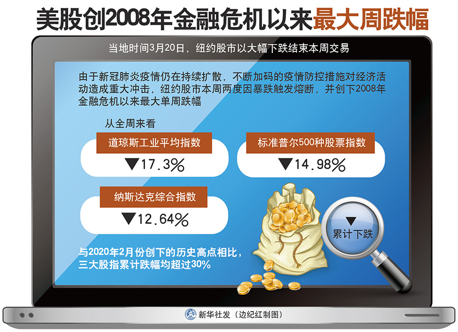 由于新冠肺炎疫情仍在持續(xù)擴散,不斷加碼的疫情防控措施對經(jīng)濟活動造成重大沖擊,紐約股市本周兩度因暴跌觸發(fā)熔斷,并創(chuàng)下2008年金融危機以來最大單周跌幅。