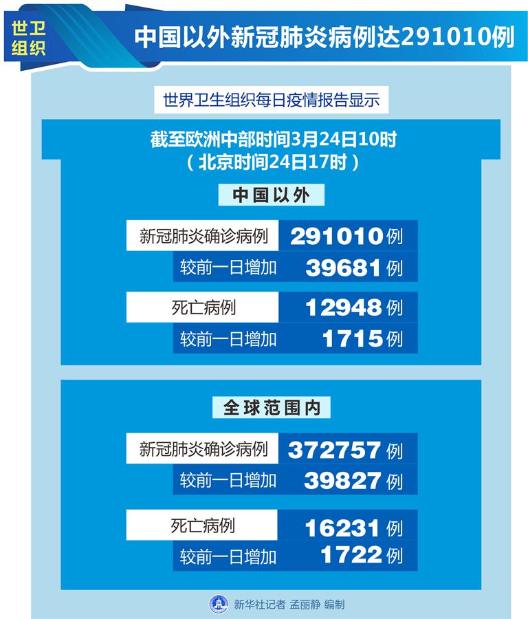 世衛(wèi)組織每日疫情報告顯示,截至歐洲中部時間24日10時(北京時間24日17時),中國以外新冠肺炎確診病例較前一日增加39681例,達(dá)到291010例;中國以外死亡病例較前一日增加1715例,達(dá)到12948例。