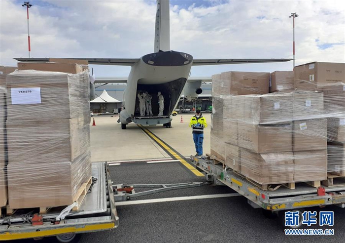 這是在意大利羅馬的菲烏米奇諾機(jī)場(chǎng)拍攝的從飛機(jī)上卸下的醫(yī)療物資(3月30日攝)。新華社發(fā)