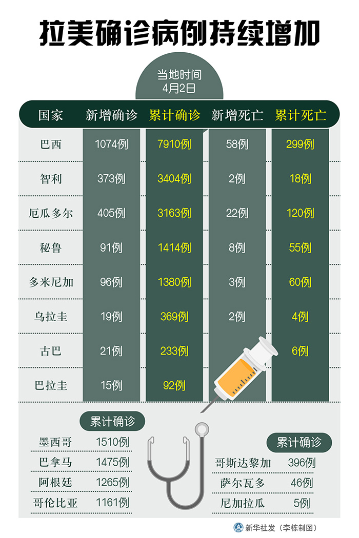 新華社圣保羅4月2日電 綜合新華社駐拉美地區(qū)記者報(bào)道:拉美各國(guó)衛(wèi)生部門(mén)2日發(fā)布的新冠疫情最新數(shù)據(jù)顯示,拉美地區(qū)確診病例持續(xù)增加。多國(guó)采取了隔離、停課、宵禁等措施應(yīng)對(duì)疫情。