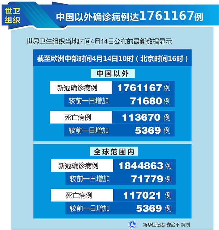 新華社日內瓦4月14日電(記者劉曲)世界衛(wèi)生組織14日公布的最新數據顯示,中國以外新冠確診病例達到1761167例。