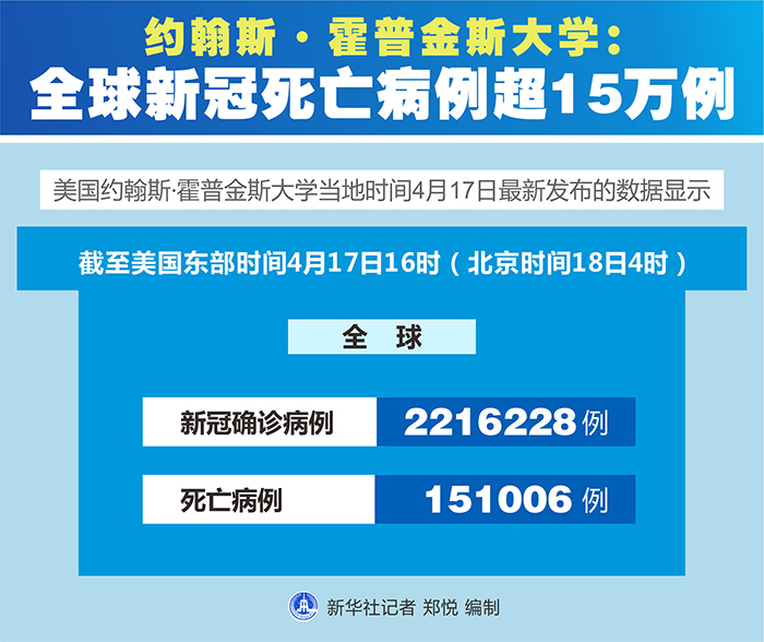 新華社紐約4月17日電 美國約翰斯·霍普金斯大學17日最新發(fā)布的數(shù)據(jù)顯示,截至美國東部時間17日16時(北京時間18日4時),全球新冠死亡病例超過15萬例,達到151006例,全球確診病例達2216228例。