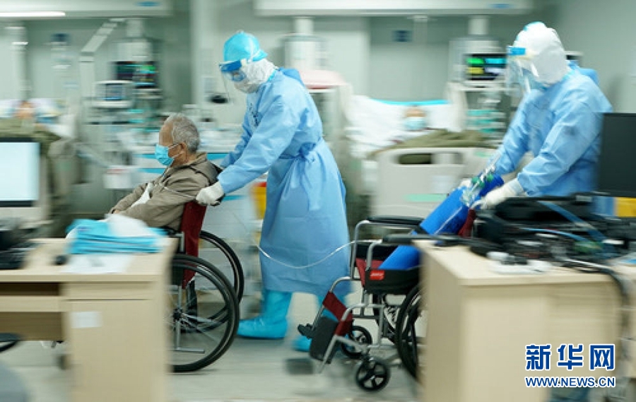 4月12日,北京協(xié)和醫(yī)院醫(yī)療隊(duì)隊(duì)員與武漢同濟(jì)醫(yī)院醫(yī)務(wù)人員共同將一名新冠肺炎危重癥患者轉(zhuǎn)往武漢同濟(jì)醫(yī)院中法新城院區(qū)ICU。在轉(zhuǎn)運(yùn)過程中,ECMO(人工膜肺)治療仍在持續(xù)進(jìn)行。?新華社記者 沈伯韓 攝