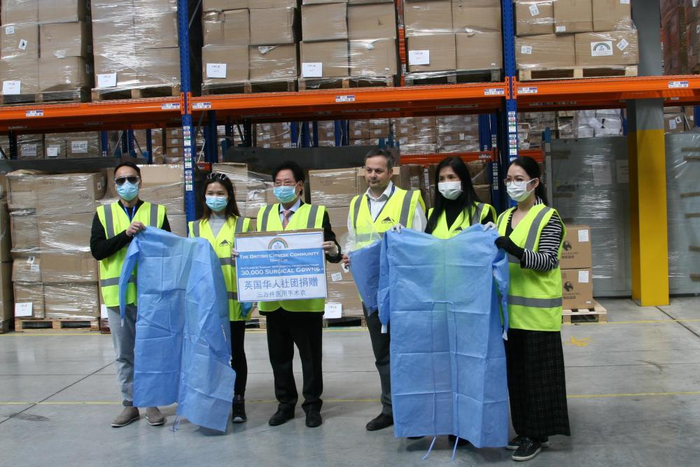 2020年4月20日,英國(guó)華僑華人社團(tuán)向英方捐贈(zèng)醫(yī)用防護(hù)服。(新華社發(fā))