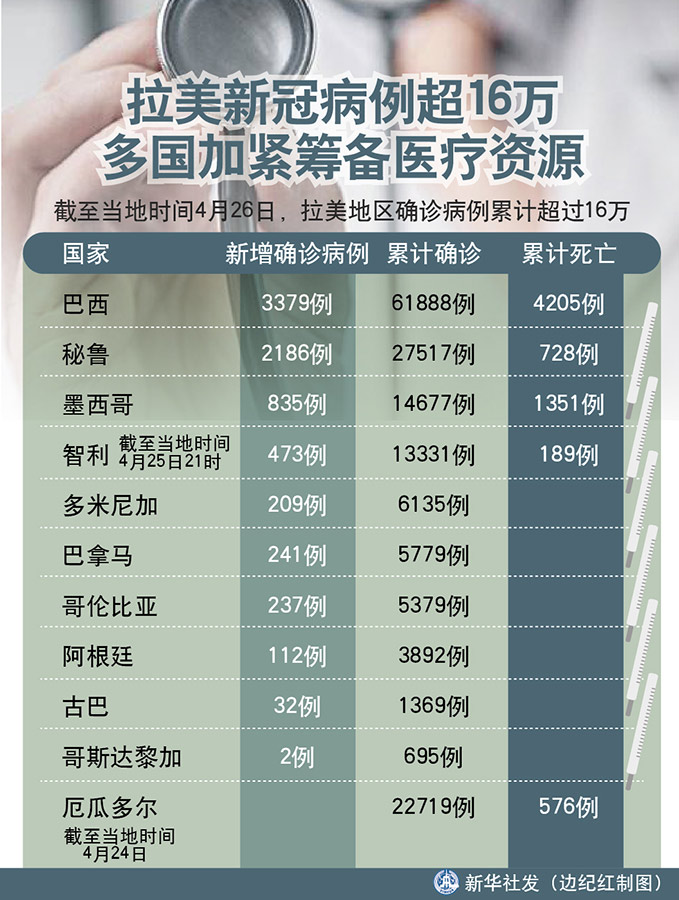 新華社墨西哥城4月26日電 綜合新華社駐拉美地區(qū)記者報(bào)道:新冠疫情在拉美多國(guó)持續(xù)蔓延。截至當(dāng)?shù)貢r(shí)間26日,拉美地區(qū)確診病例累計(jì)超過(guò)16萬(wàn)。多國(guó)政府為應(yīng)對(duì)疫情,加緊籌備醫(yī)療物資,增派醫(yī)療人員。