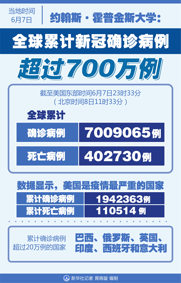 約翰斯·霍普金斯大學:全球累計新冠確診病例超700萬例-新華網(wǎng)