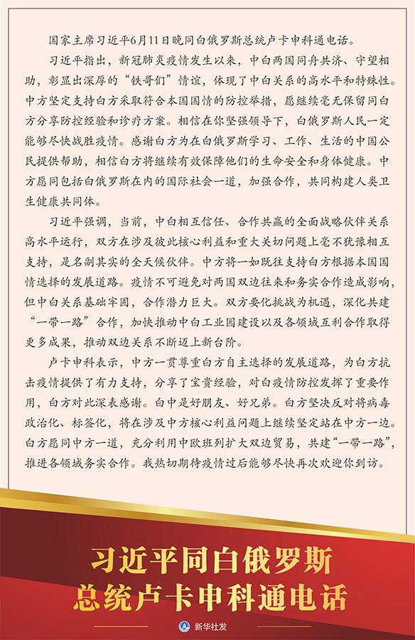 習(xí)近平指出,新冠肺炎疫情發(fā)生以來,中白兩國同舟共濟(jì)、守望相助,彰顯出深厚的“鐵哥們”情誼,體現(xiàn)了中白關(guān)系的高水平和特殊性。中方堅定支持白方采取符合本國國情的防控舉措,愿繼續(xù)毫無保留同白方分享防控經(jīng)驗(yàn)和診療方案。相信在你堅強(qiáng)領(lǐng)導(dǎo)下,白俄羅斯人民一定能夠盡快戰(zhàn)勝疫情。感謝白方為在白俄羅斯學(xué)習(xí)、工作、生活的中國公民提供幫助,相信白方將繼續(xù)有效保障他們的生命安全和身體健康。中方愿同包括白俄羅斯在內(nèi)的國際社會一道,加強(qiáng)合作,共同構(gòu)建人類衛(wèi)生健康共同體。